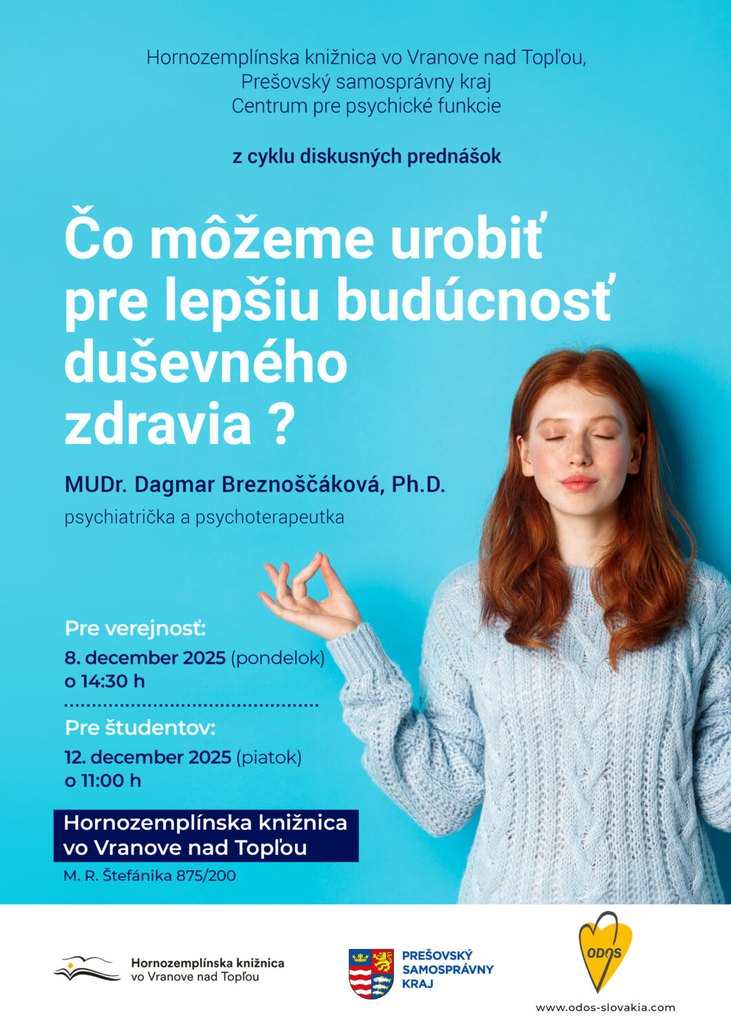 Na tieto a podobné otázky týkajúce sa duševného zdravia a rovnováhy zodpovie širokej verejnosti a mládeži vo svojej prednáške úspešná Vranovčanka MUDr. Dagmar Breznoščáková, Ph.D. Renomovaná psychiatrička, psychoterapeutka, klinická výskumníčka a znalkyňa v odbore psychiatria, krajská odborníčka pre MZ SR v odbore psychiatria. Pôsobí na Lekárskej fakulte UPJŠ v Košiciach, kde sa venuje výučbe a výskumu v oblasti psychiatrie, psychoterapie a psychosomatiky.