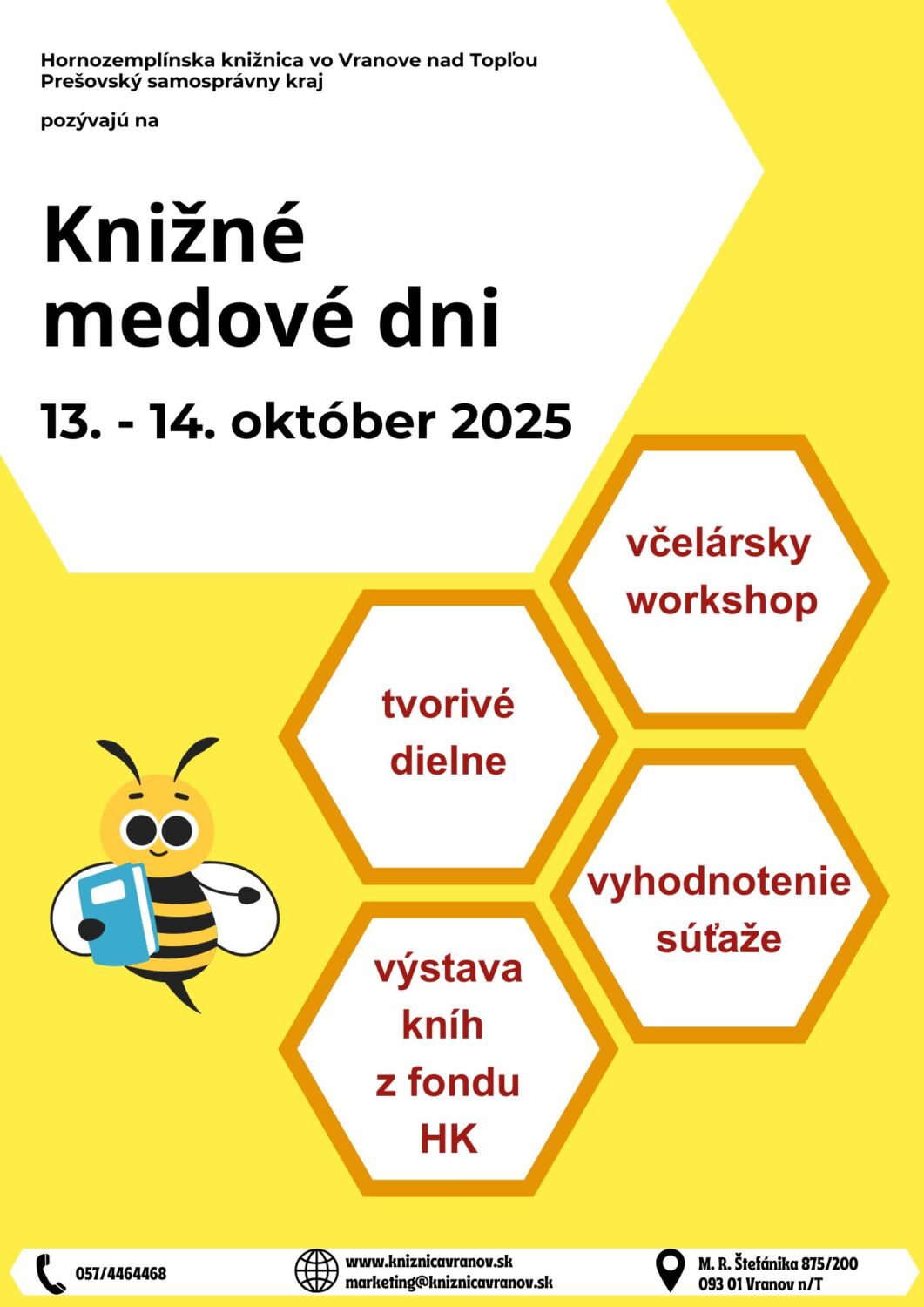 Hornozemplínska knižnica vo Vranove nad Topľou Vás pozýva na podujatie Knižné medové dni 2025, ktoré sa uskutočnia v dňoch od 13. do 14. októbra 2025.