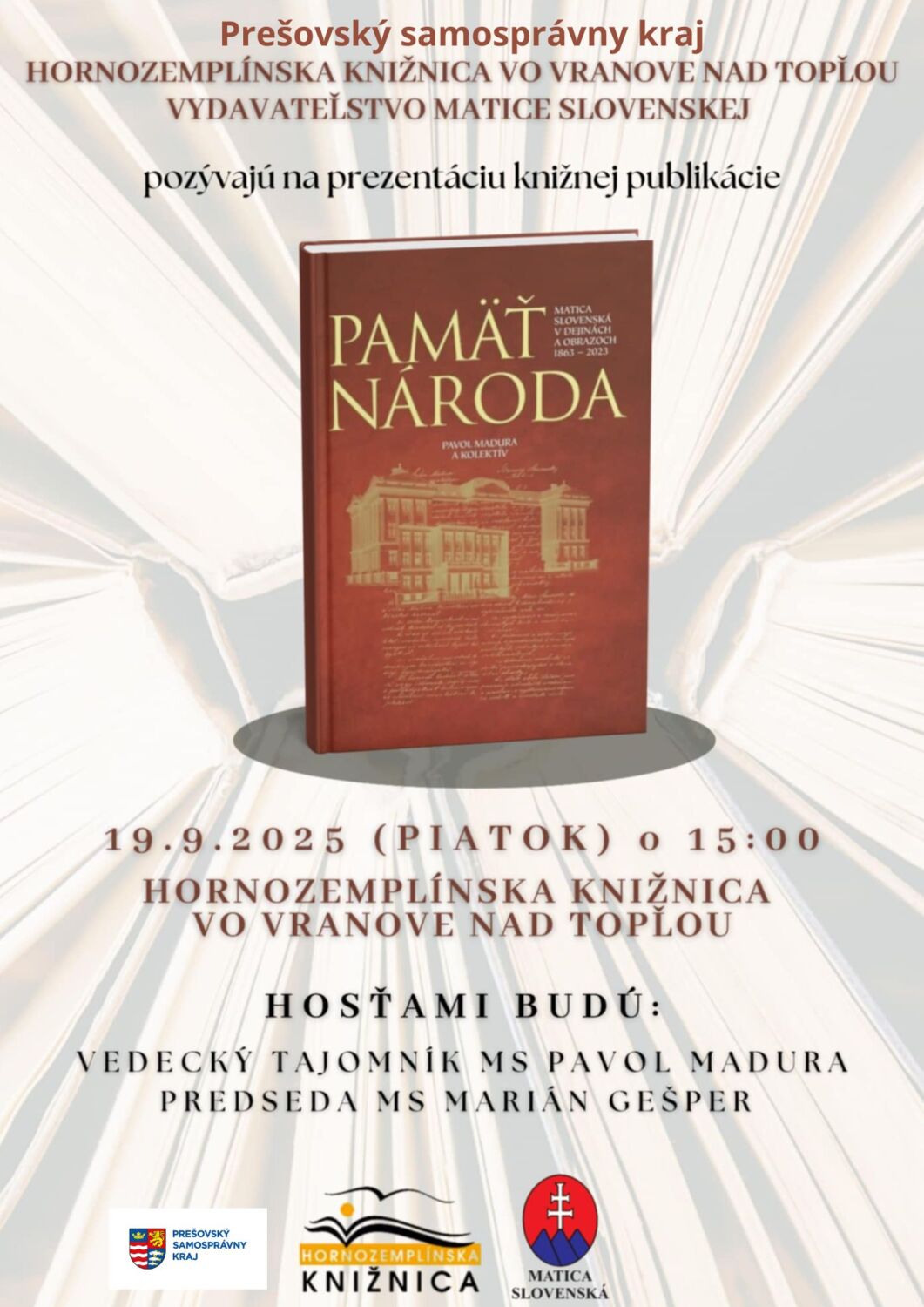 Hornozemplínska knižnica vo Vranove nad Topľou vás pozýva v piatok 19. septembra 2025 o 15.00 h na stretnutie s vedeckým tajomníkom Pavlom Madurom, editorom a autorom monografie Pamäť národa, s podtitulom Matica slovenská v dejinách a obrazoch 1863 – 2023 a predsedom Matice slovenskej Mariánom Gešperom. Súčasťou podujatia bude prezentácia novej publikácie Pamäť národa, spojená s autogramiádou.