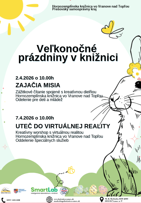 Milé deti, milí rodičia, pozývame vás stráviť veľkonočné prázdniny trochu inak – hravo, tvorivo a s knihou v Hornozemplínskej knižnici.