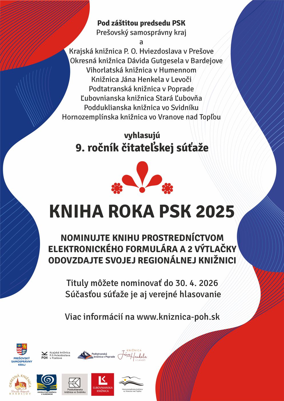 Pod záštitou predsedu PSK a v spolupráci s Vami, otvárame ďalší, 9. ročník Knihy roka PSK a s ním príležitosť nominovať knižné tituly z roku 2025 do regionálnej literárnej súťaže KNIHA ROKA 2025.